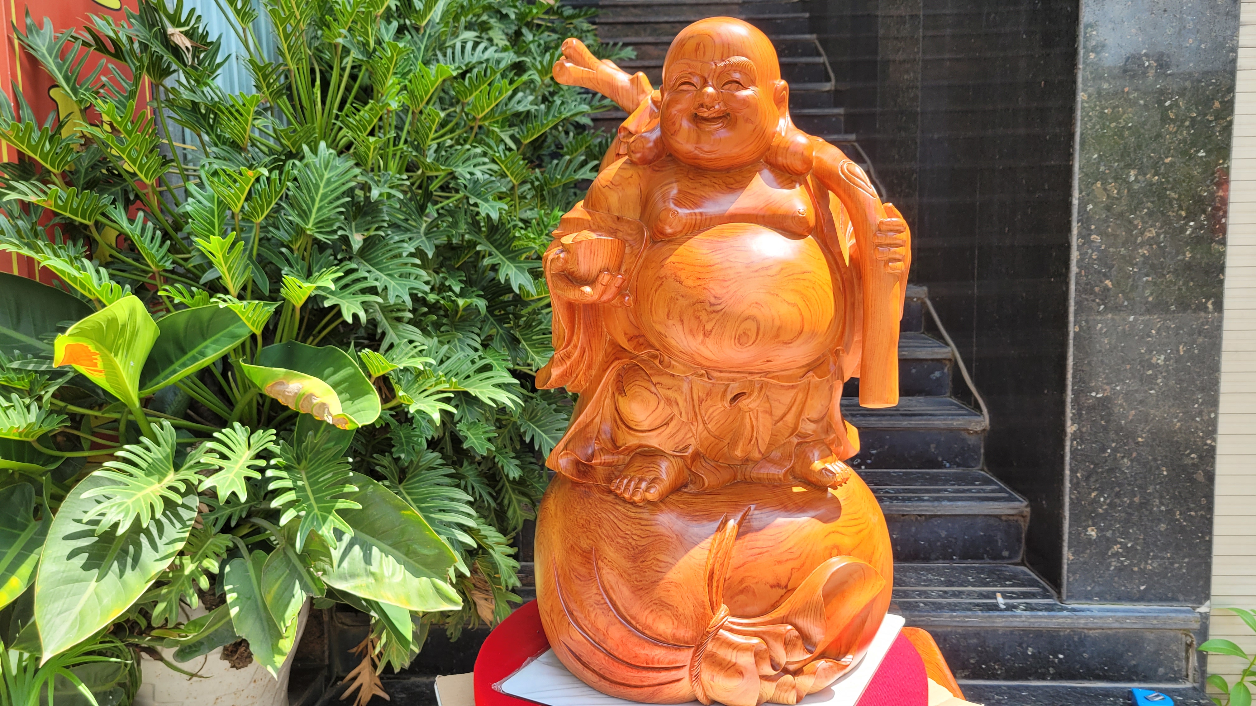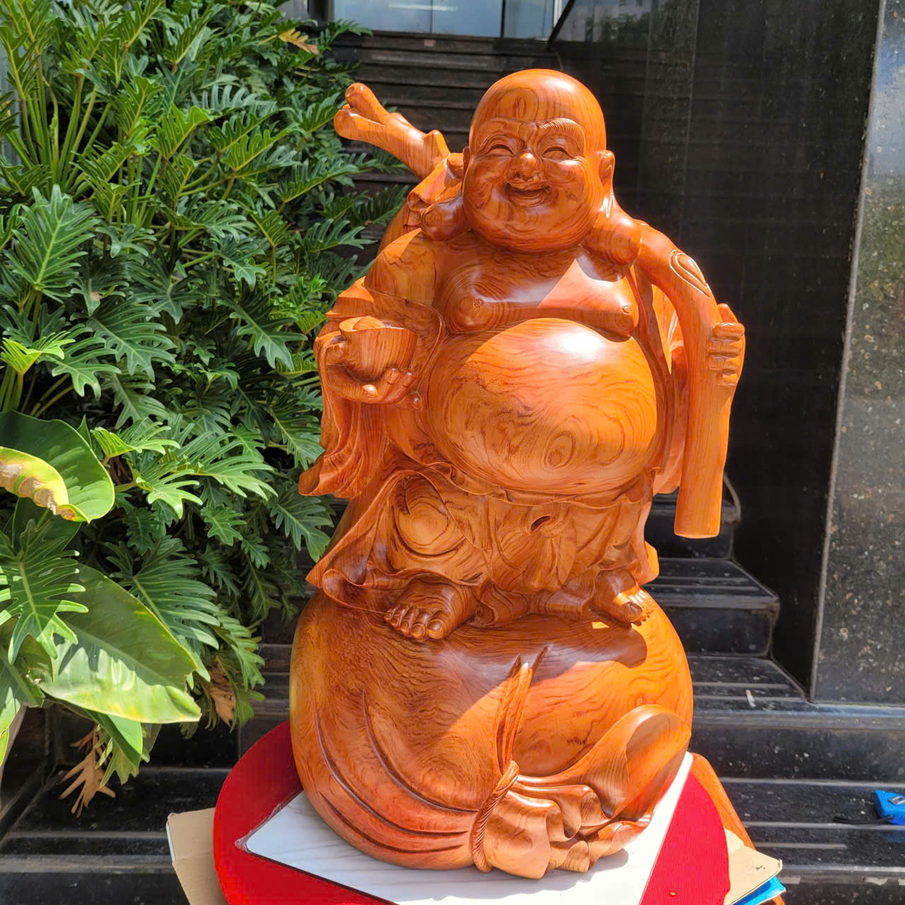 Tượng Di Lặc gỗ hương đá – Biểu tượng tài lộc và hạnh phúc được làm từ gỗ tự nhiên nguyên khối, trạm khắc tinh xảo, khắc họa hình ảnh tượng phật di lạc - vị phật đến từ tương lai đứng trên một bị tiền to, trên vai còn gánh một bị tròn căng và một tay cầm thỏi vàng.