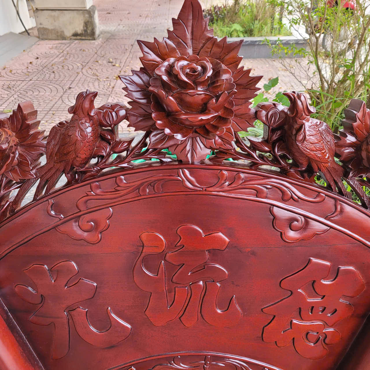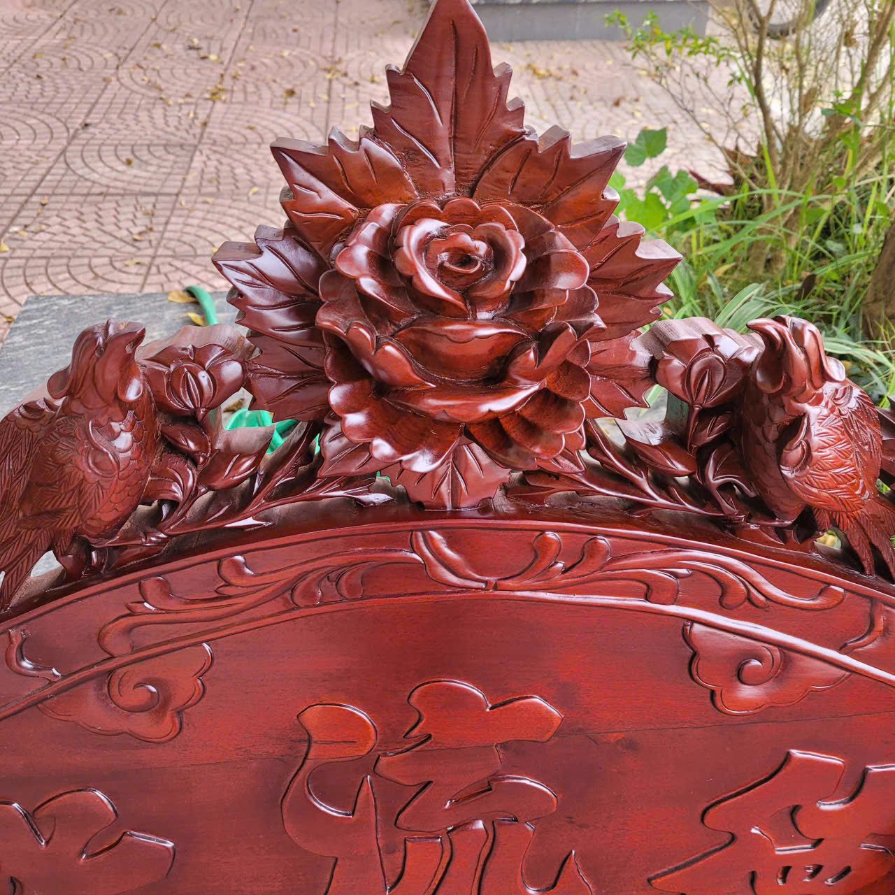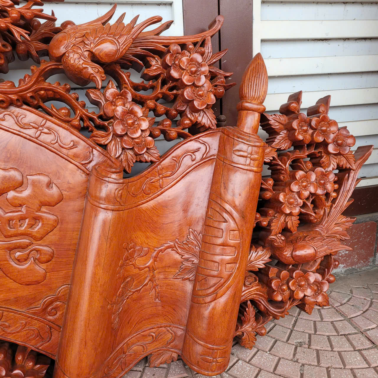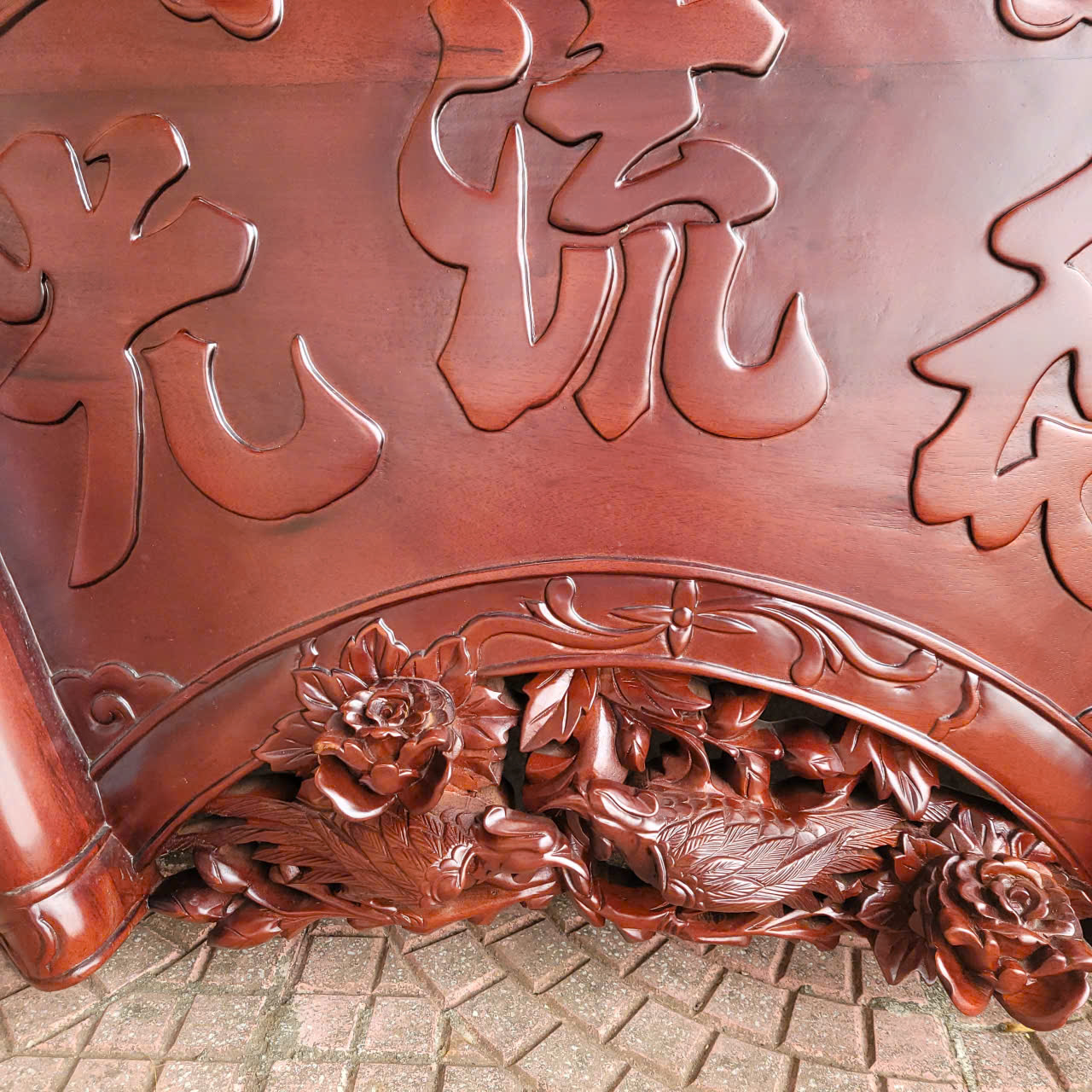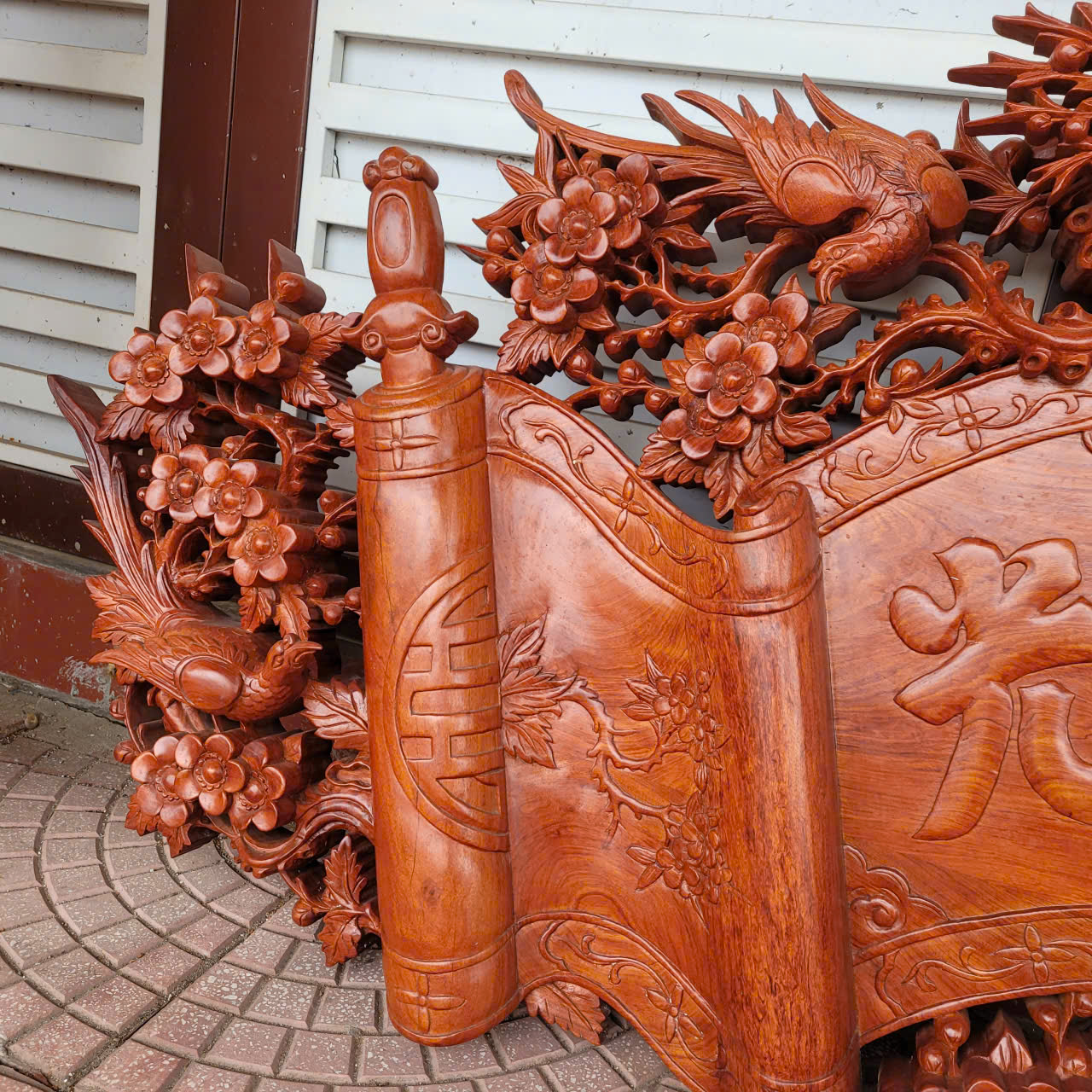 2 câu đối được làm nguyên tấm gỗ dày 5cm, được ghép thêm đầu phượng và những bông hoa hồng để tạo độ nổi kênh bong. Đường nét trạm khắc cực kì uyển chuyển, mềm mại tinh xảo và sắc nét cùng với đôi câu đối gửi gắm những triết lý , những bài học sâu sắc và nhân nghĩa của tổ tiên dành cho con cháu.: