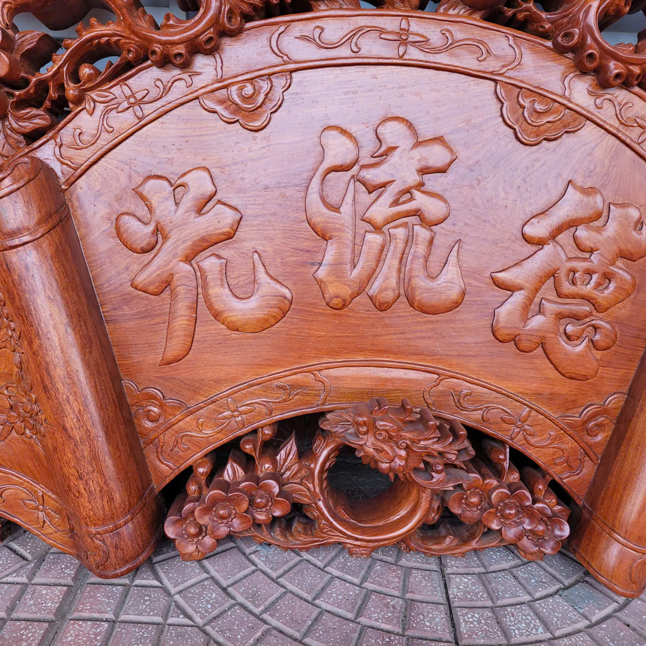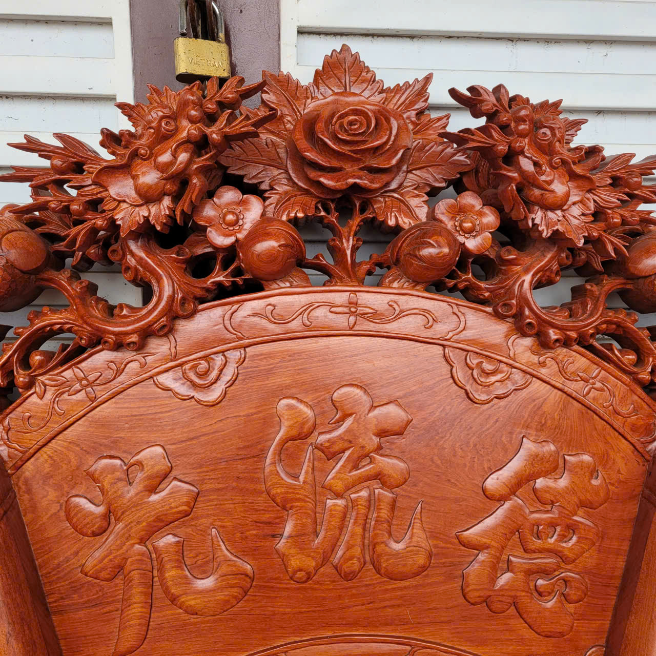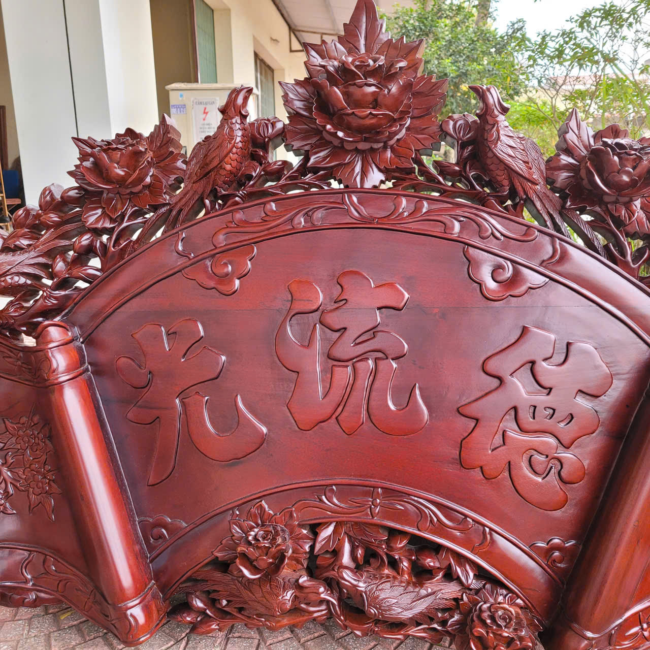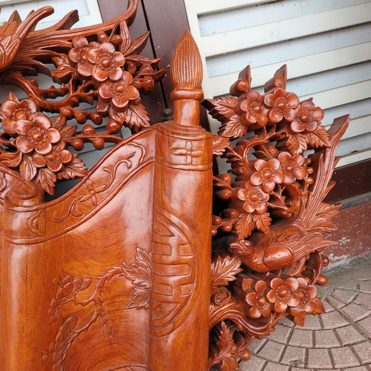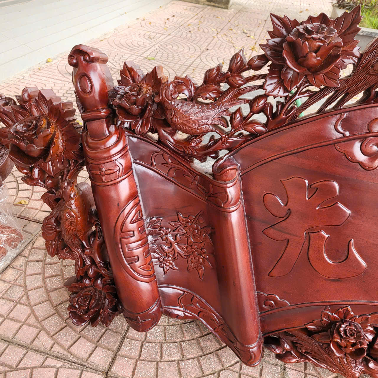 2 câu đối được làm nguyên tấm gỗ dày 5cm, được ghép thêm đầu phượng và những bông hoa hồng để tạo độ nổi kênh bong. Đường nét trạm khắc cực kì uyển chuyển, mềm mại tinh xảo và sắc nét cùng với đôi câu đối gửi gắm những triết lý , những bài học sâu sắc và nhân nghĩa của tổ tiên dành cho con cháu.: