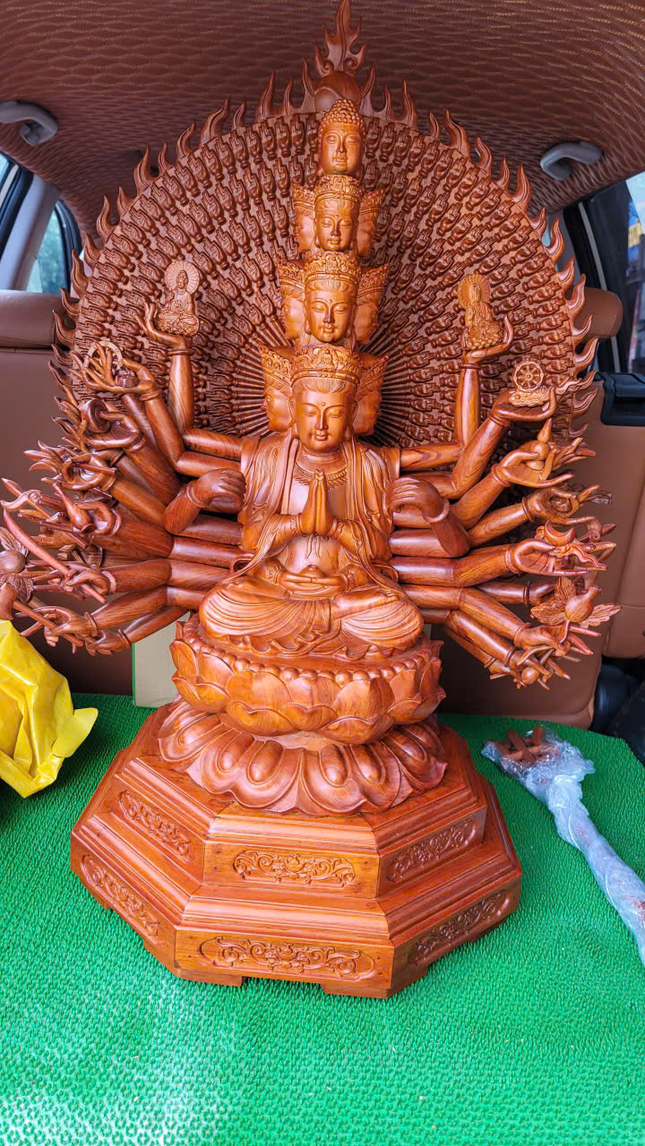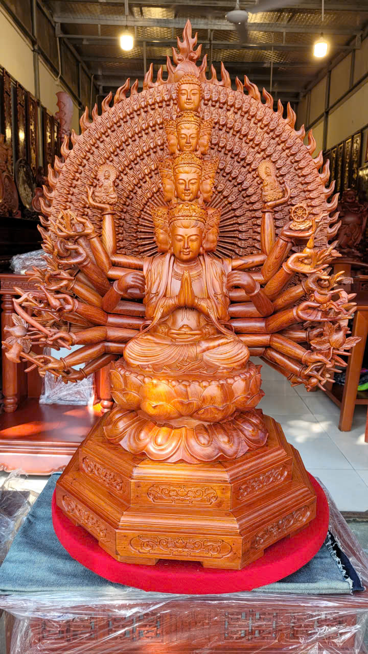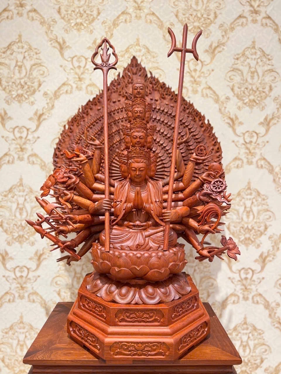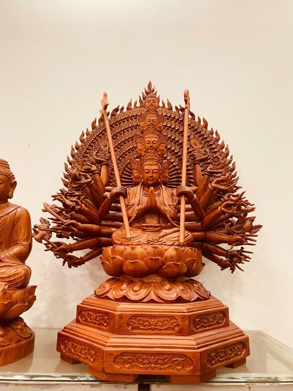 Với chất liệu gỗ tự nhiên hương đá,dưới bàn tay khéo léo của các nghệ nhân tài hoa ,đã chế tác lên một bức tượng phật bà nghìn mắt nghìn tay rất công phu, đường nét trạm khắc điêu luyện và tinh xảo, có thể nói bức tượng là một kiệt tác nghệ thuật có 1 không 2.