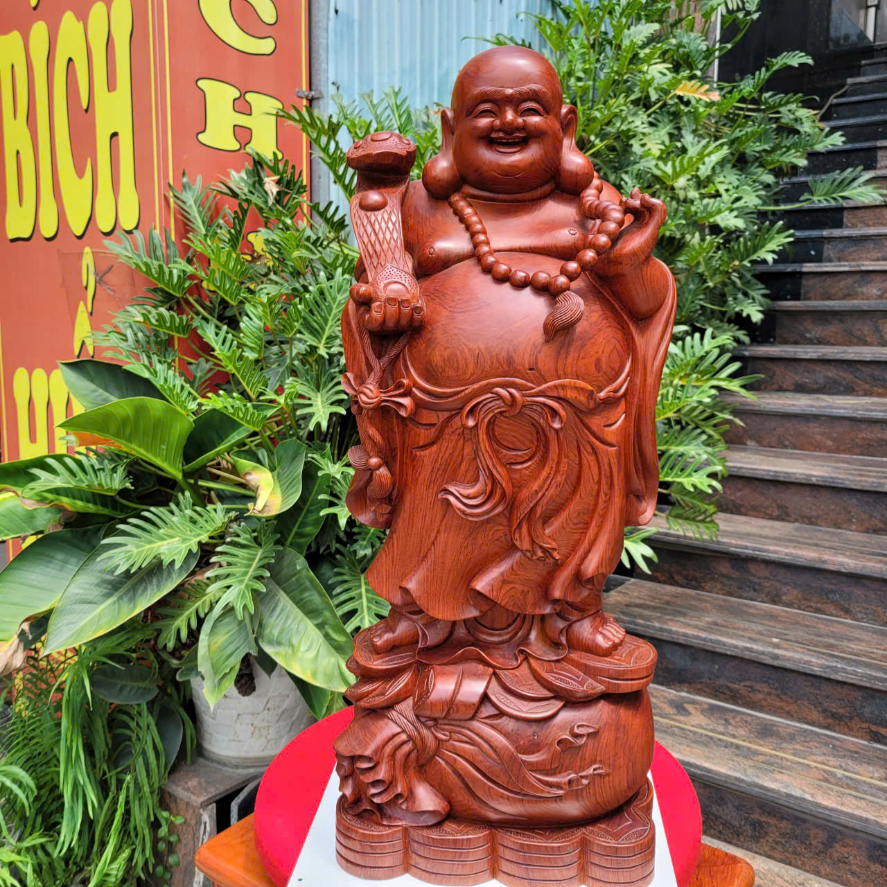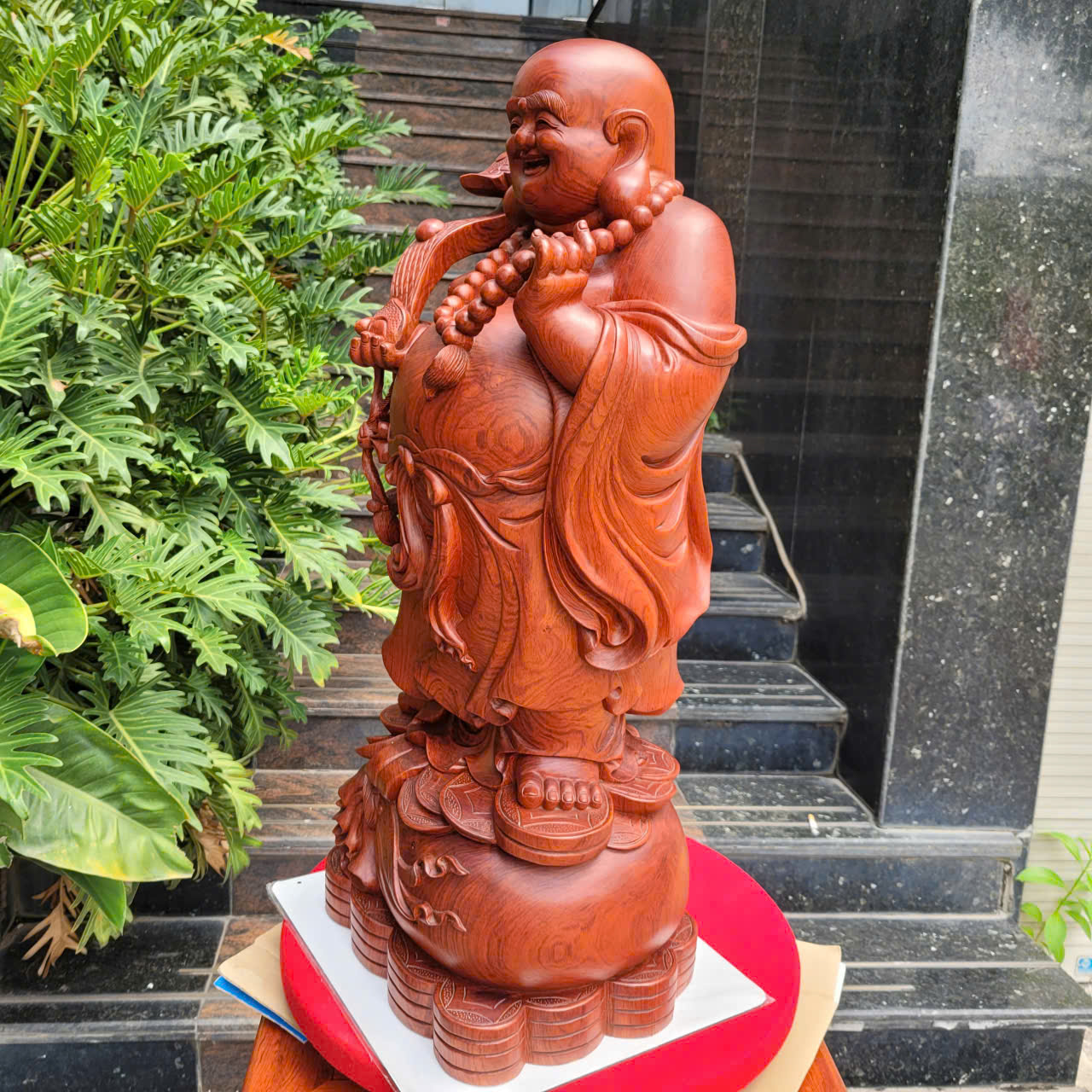 Tượng di lạc như ý - biểu tượng của hạnh phúc được làm từ gỗ tự nhiên nguyên khối, trạm khắc tinh xảo, sắc nét, với dáng đứng, trên tay cầm gậy như ý, một tay nâng chuỗi tràng hạt. Ngài đứng trên một chiếc bị rất to, căng, dưới có rất nhiều tiền tất cả đều được chế tác thủ công rất đẹp.